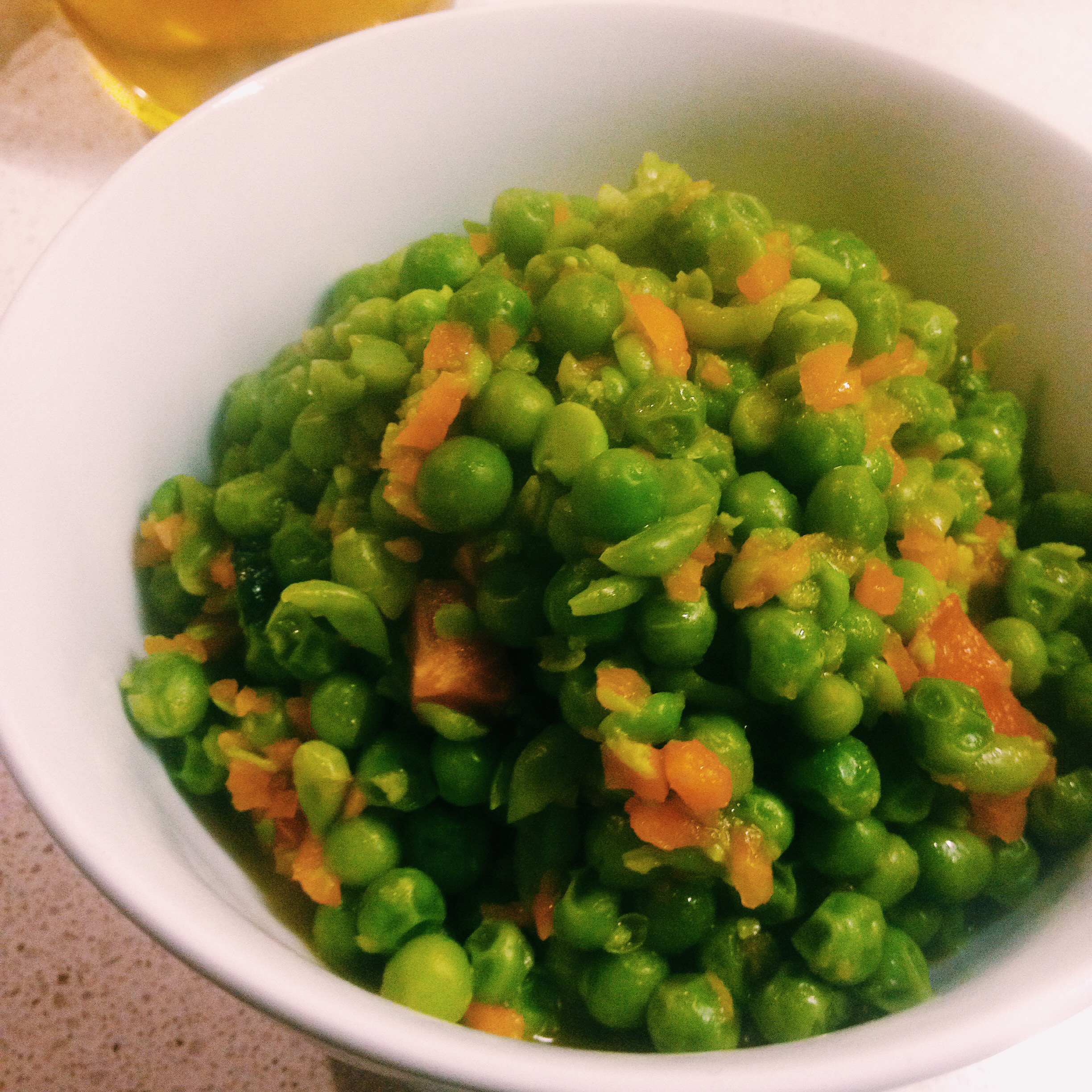 600 gr. piselli congelati – 1 cipollotto – 1 carota – 30 gr. olio e.v.o. – sale q.b. – 2 foglie di lattuga – 2 pomodori piccoli maturi (oppure 1 grande) – 120 gr. di acqua tiepida.