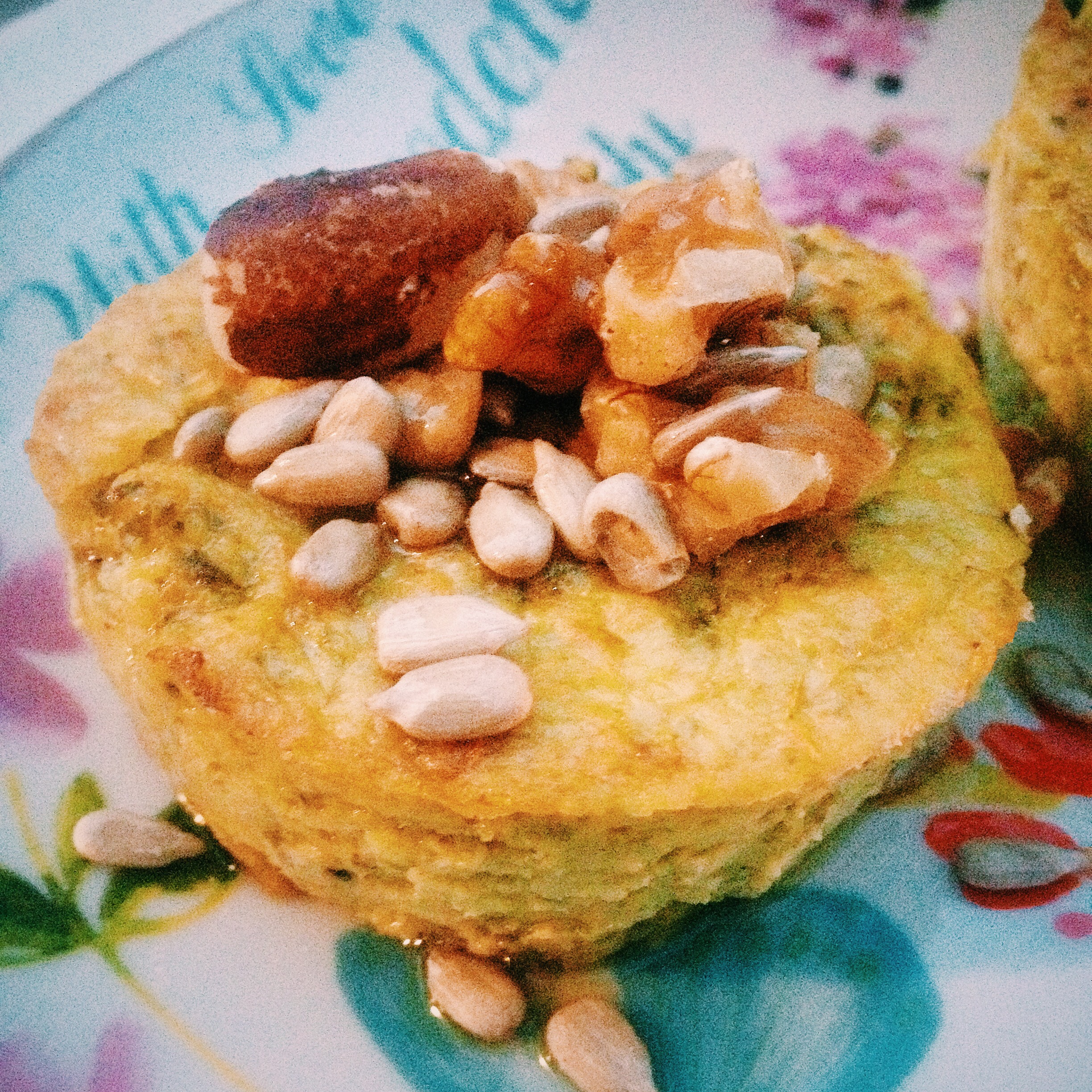 500 gr. di zucchine – 1 uovo – 3 cucchiai di parmigiano grattugiato – mezza cipolla bianca – 2 cucchiai colmi di yogurt greco – 20 gr. di olio e.v.o. – origano – sale e pepe q.b. – noci, noci pecan e semi di girasole per guarnire