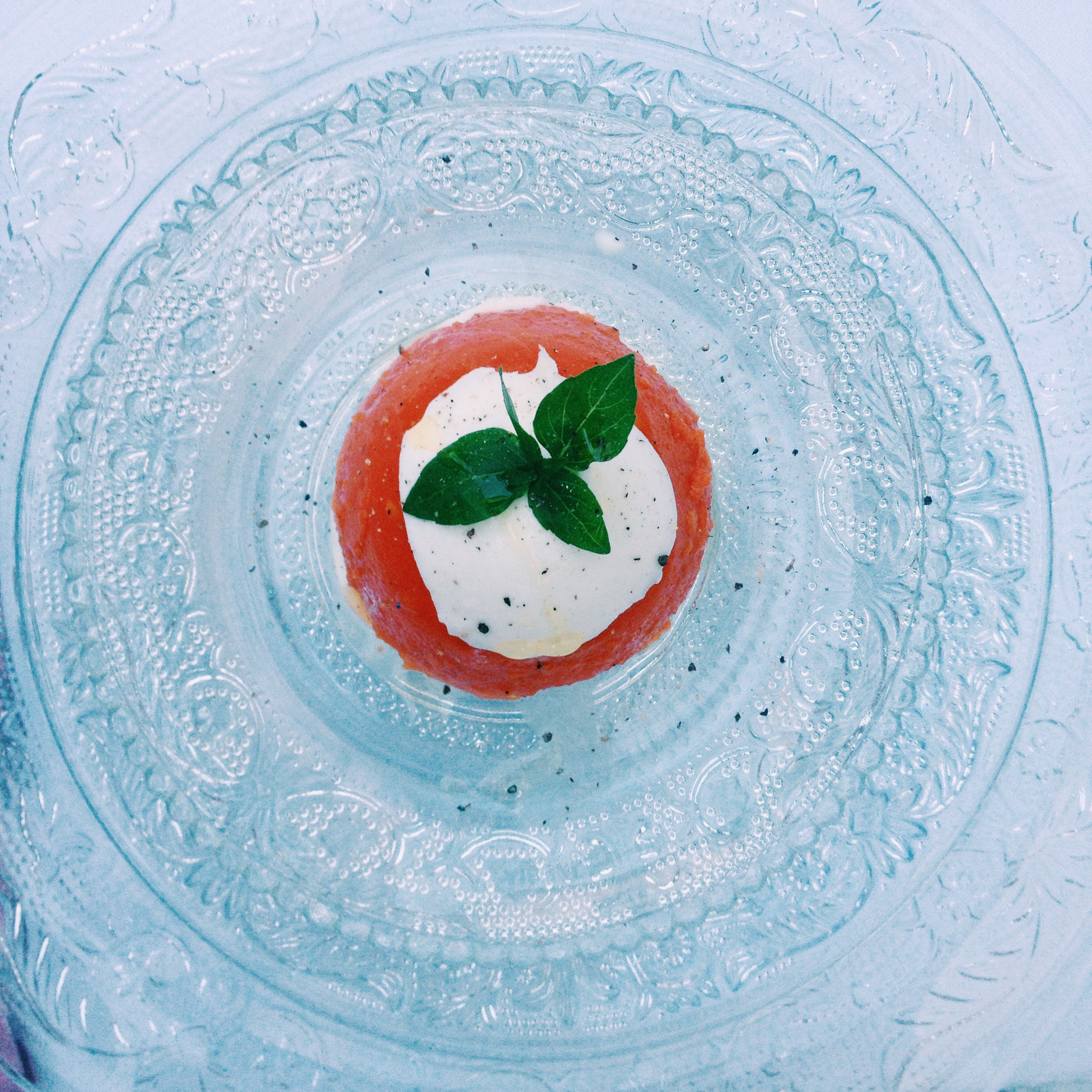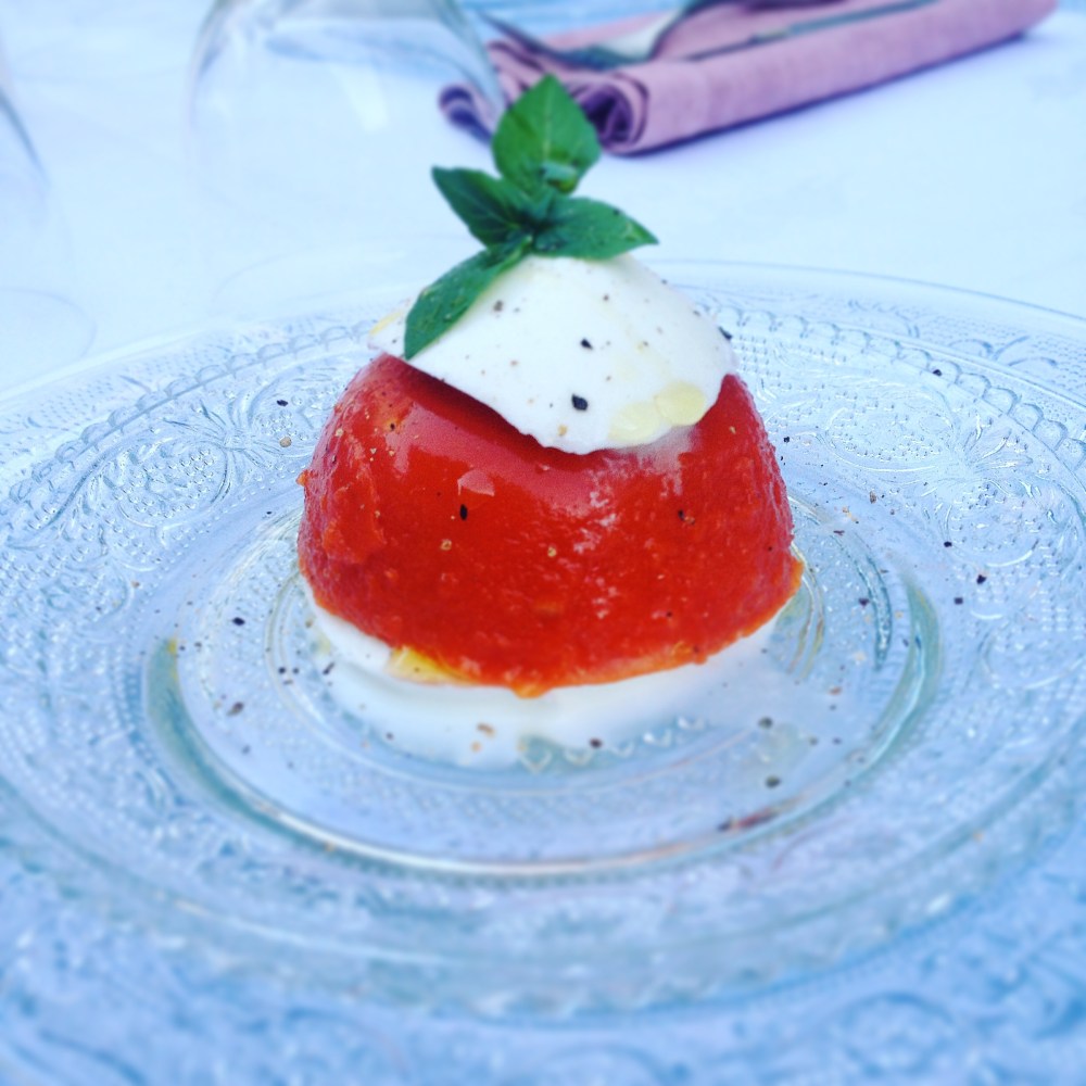 - Adagiare su ogni fetta di bufala la gelatina di pomodoro, guarnire con basilico fresco, pepe ed olio