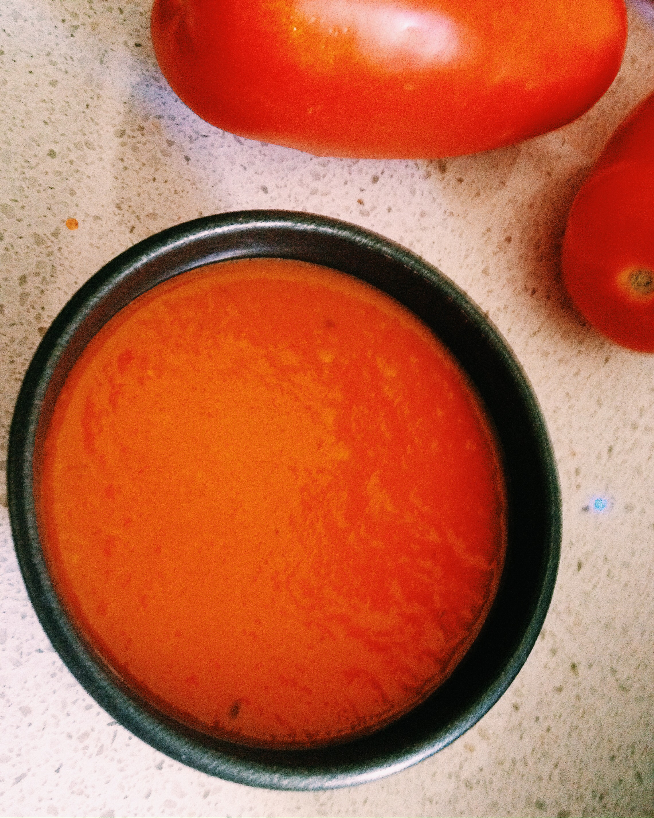 8 pomodori perini maturi – 2 spicchi di aglio – qualche foglia di basilico – 20 gr. di olio e.v.o. – 2 fogli di colla di pesce – una mozzarella di bufala – sale e pepe q.b.