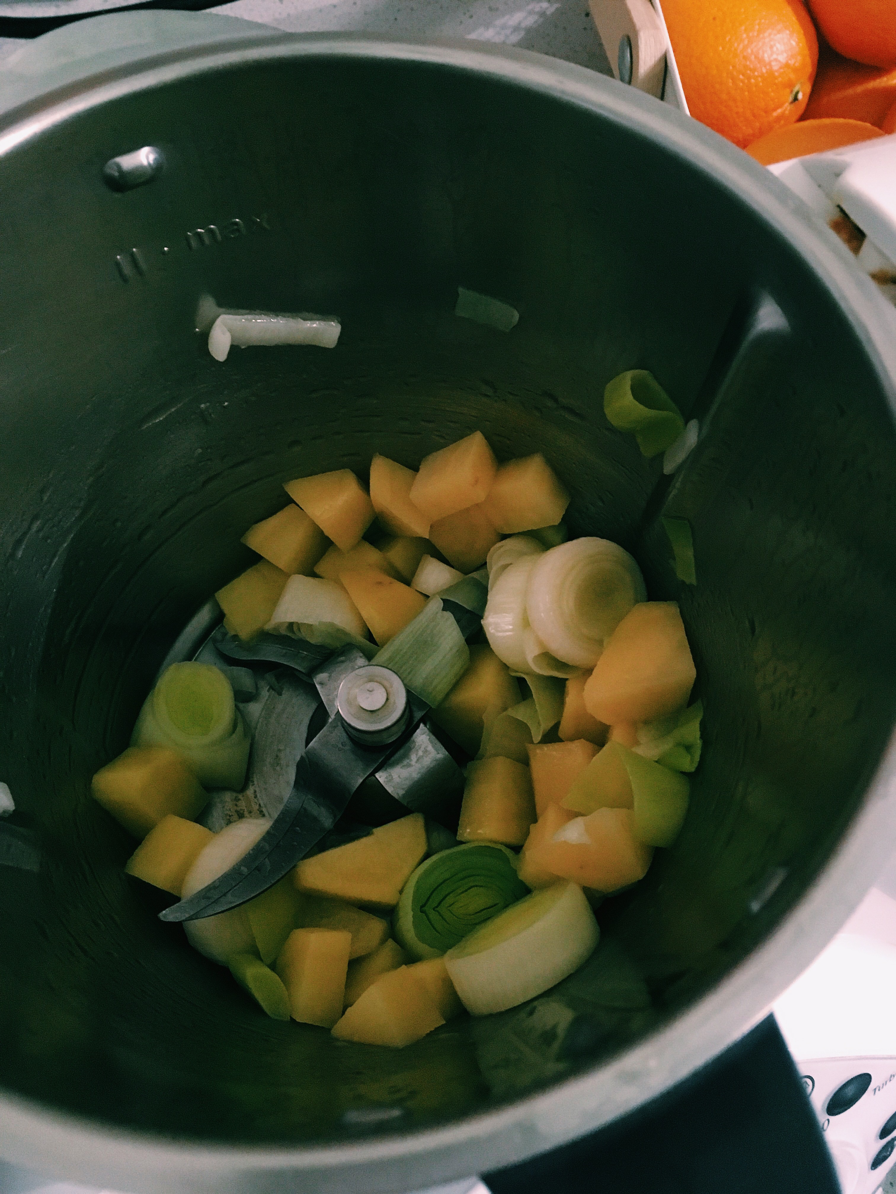 - Inserire nel boccale pulito il cipollotto, la patata in pezzi piccoli ed il porro tagliato in rondelle con l’olio e.v.o. soffriggere per 3 min./100°/vel.1