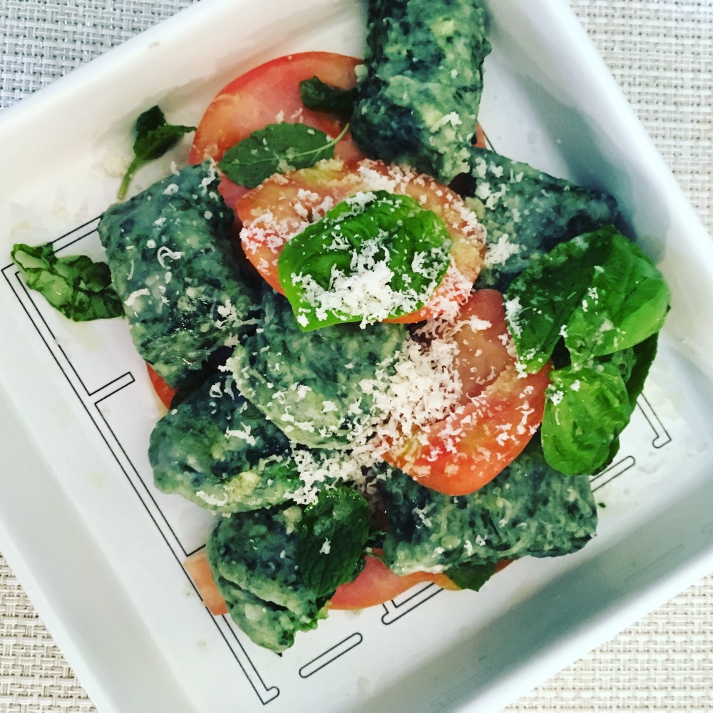 300 gr. di farina 00 bio – 400 gr. di spinaci (io ho usato quelli congelati) – 250 gr. di ricotta – la scorza di mezzo limone – 2 uova – 2 pomodori occhio di bue – basilico – olio e.v.o, sale e pepe q.b.