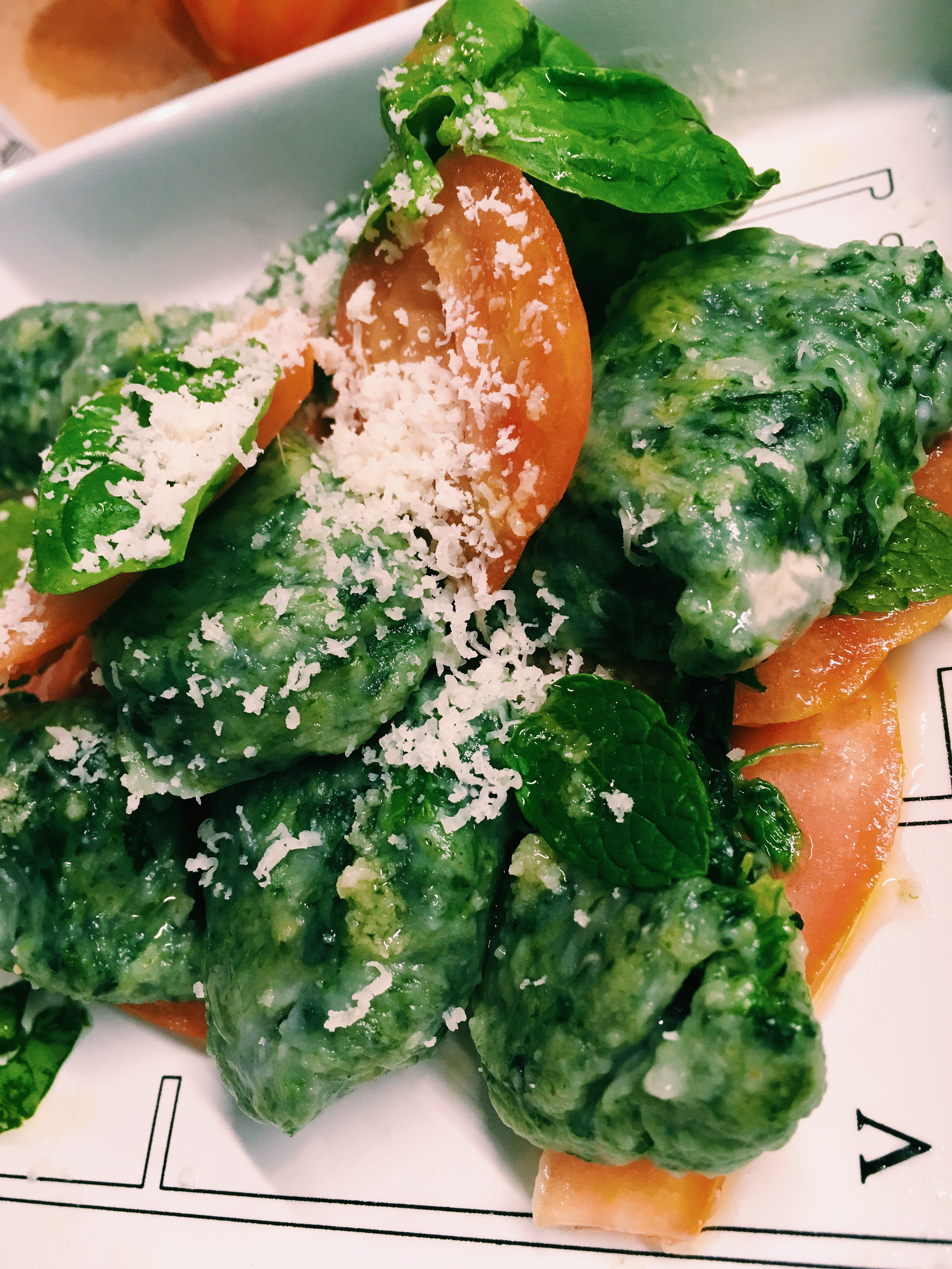 - Adagiare delicatamente gli gnudi sopra l’insalata di pomodori, condire con olio e basilico