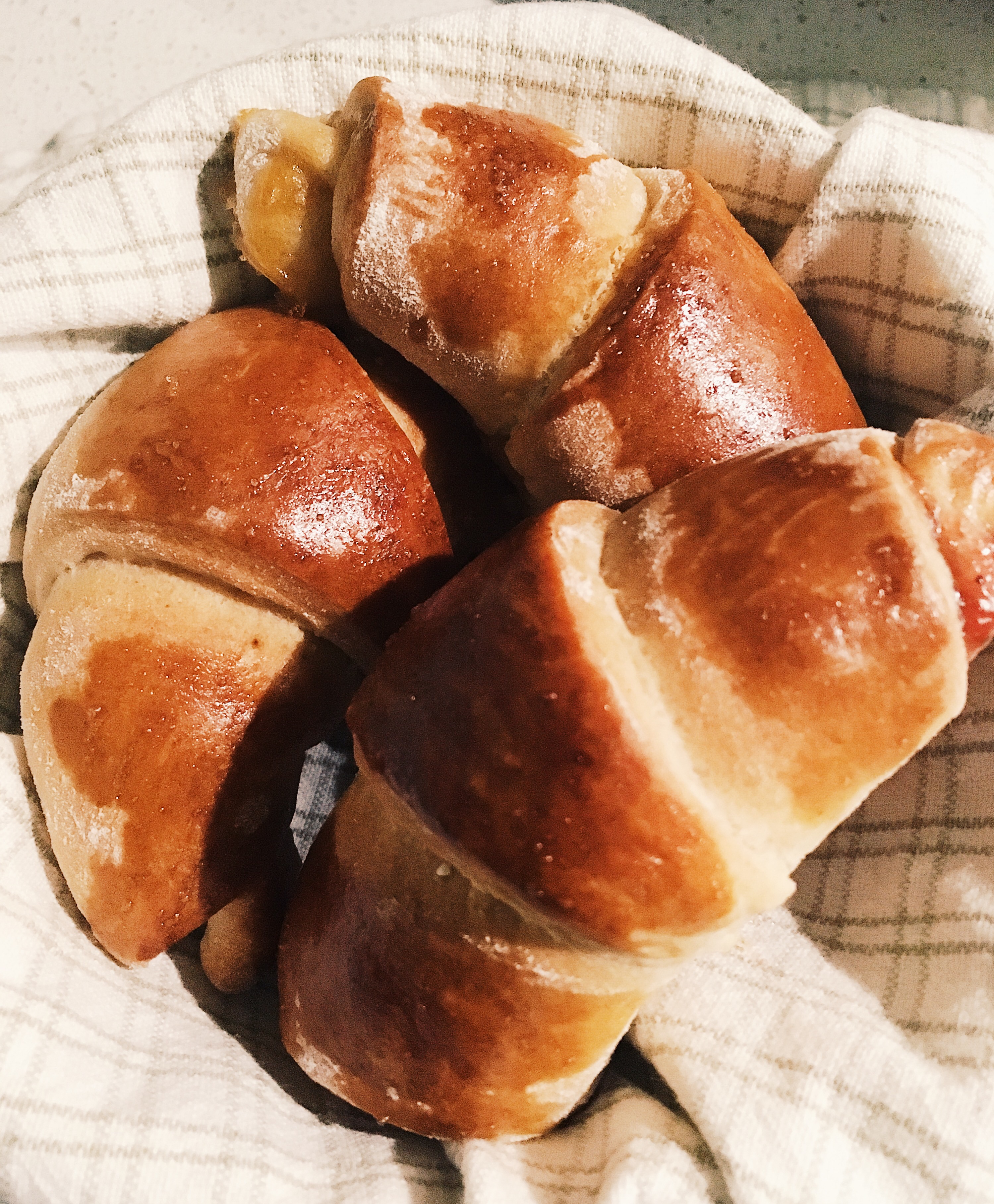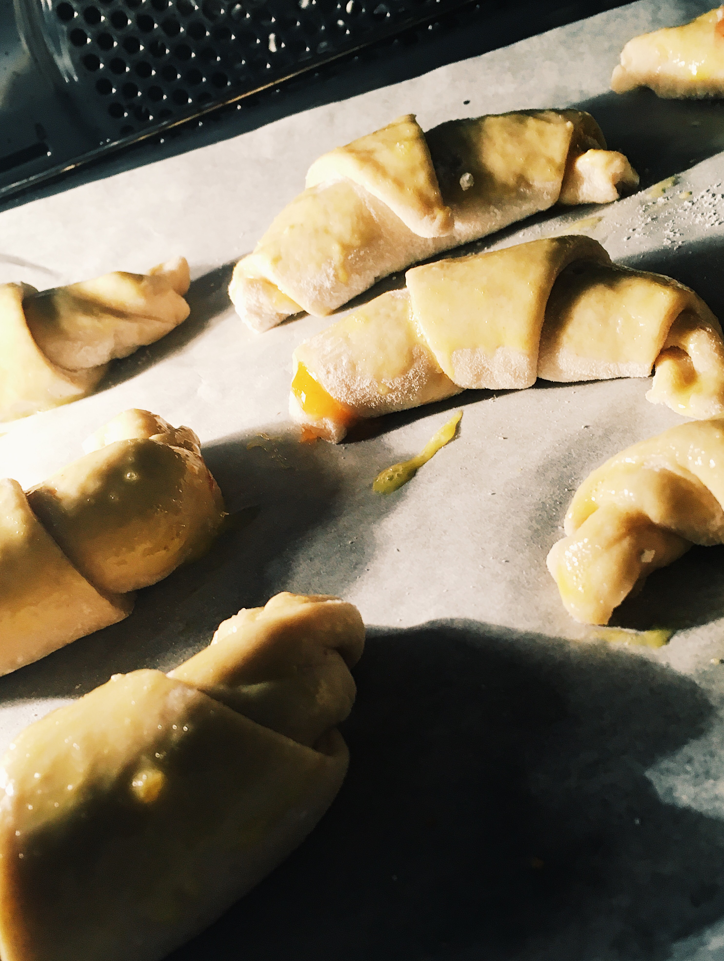 - Al centro di ogni triangolo mettere un cucchiaino di marmellata (o Nutella…:-)) e arrotolarli su se stessi per formare la brioche.