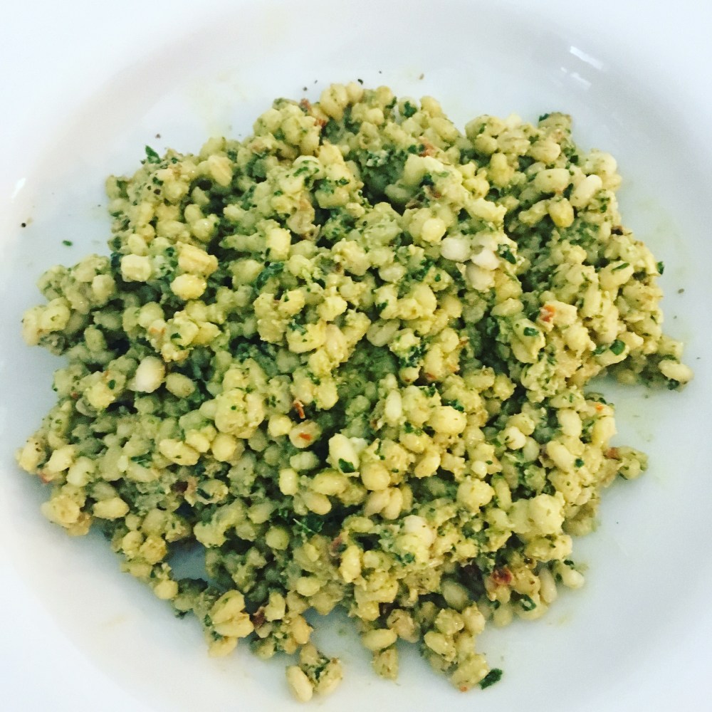 - Aggiungere al pesto un mestolo di acqua di cottura e mescolare per alcuni secondi, poi aggiungere l’orzo e mescolare per un paio di minuti