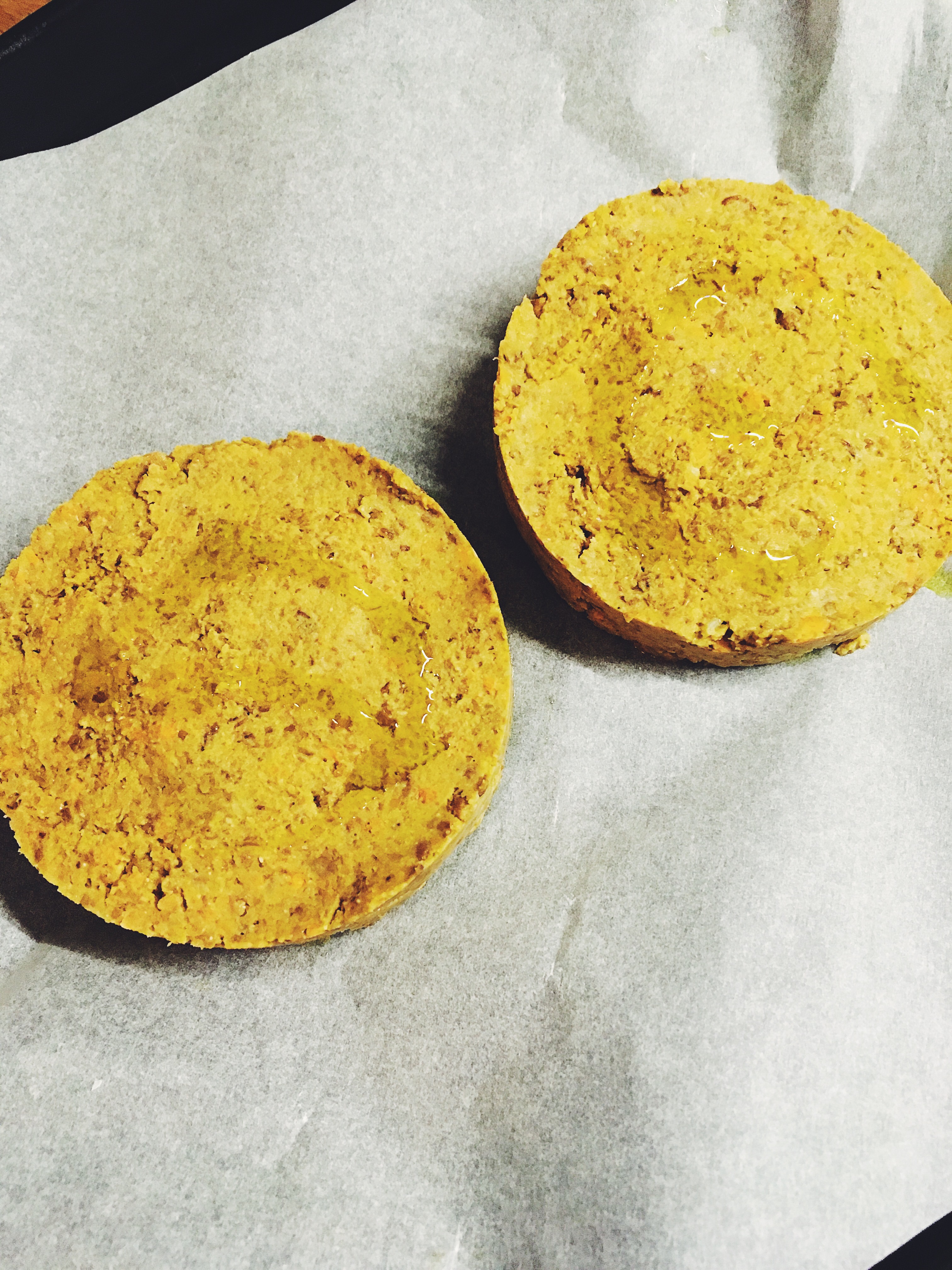 - Utilizzare un coppapasta rotondo. Oliare le pareti e appoggiarlo sulla teglia da forno rivestita con carta. Inserire metà del composto di lenticchie e livellarlo leggermente con l’aiuto di un cucchiaio. Estrarre delicatamente il coppapasta e ripetere l’operazione con l’altra metà del composto
