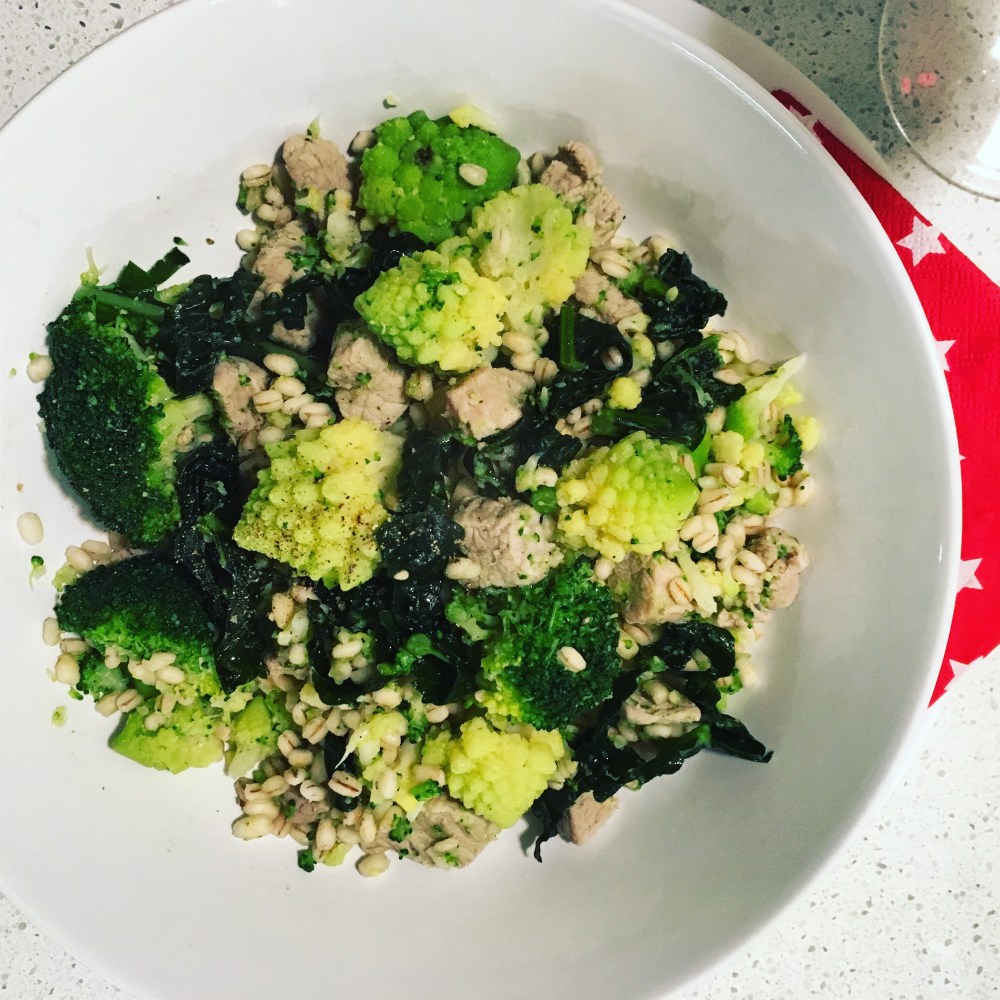 150 gr. di orzo – 2 cucchiai di olio – 140 gr di vitello in bocconcini (tipo spezzatino) – mezzo cavolo romanesco – un paio di cimette di broccoli – 3 foglie di cavolo nero