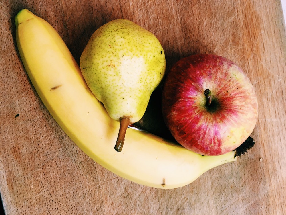 - Sbucciare la mela (usare solo uno spicchio), la pera e la banana