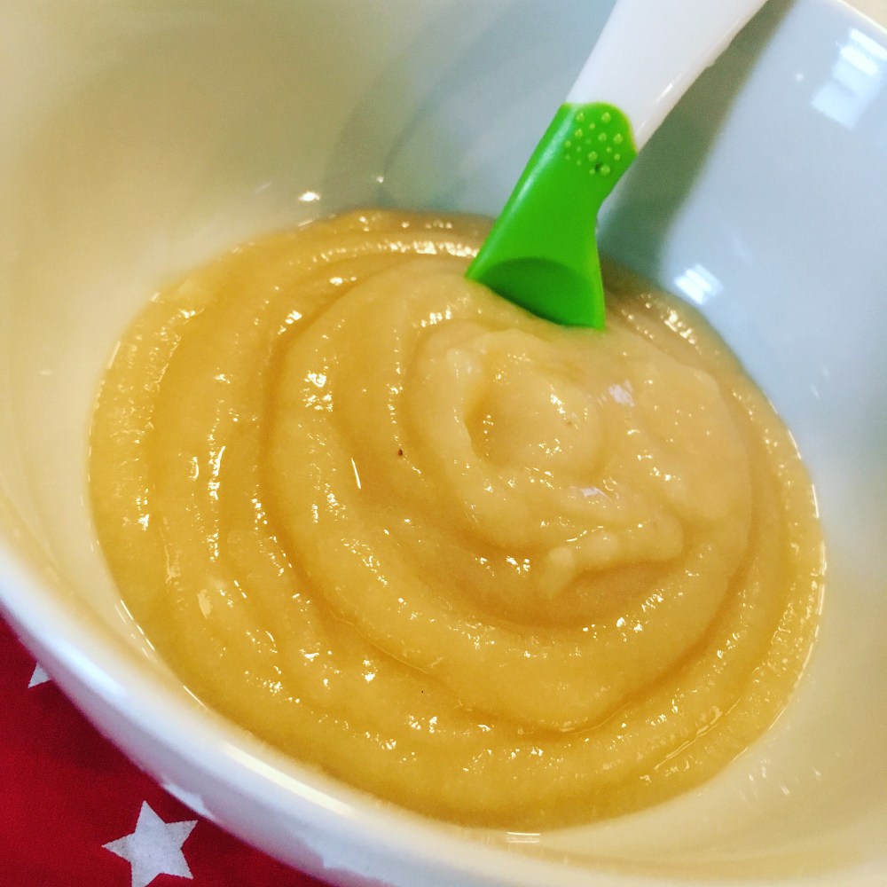 1 spicchio di mela Golden – 1 pera Williams (o Abate) – un pezzetto di banana (circa 4-5 cm) – 20 gr. di acqua- un cucchiaino scarso di biscottino granulato per latte