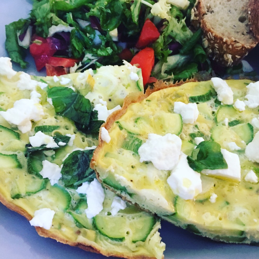 3 zucchine con fiore – 1 porro – feta – 4 uova – un lime – sale e pepe q.b. – un po’ di basilico e menta per guarnire