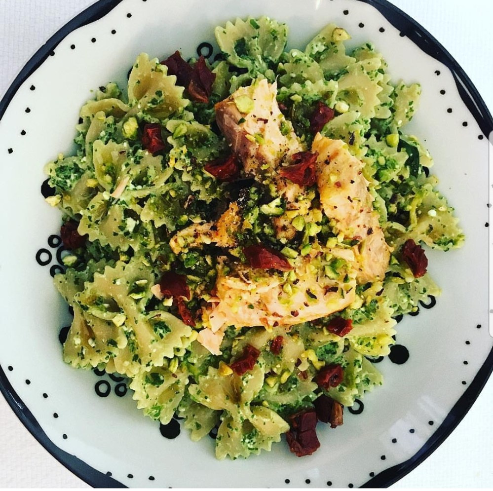- Condire la pasta con il pesto di rucola e feta, il salmone cotto nel succo di arancia, i pomodori secchi tagliati a pezzettini e spolverare con la granella di pistacchi e una macinata di pepe