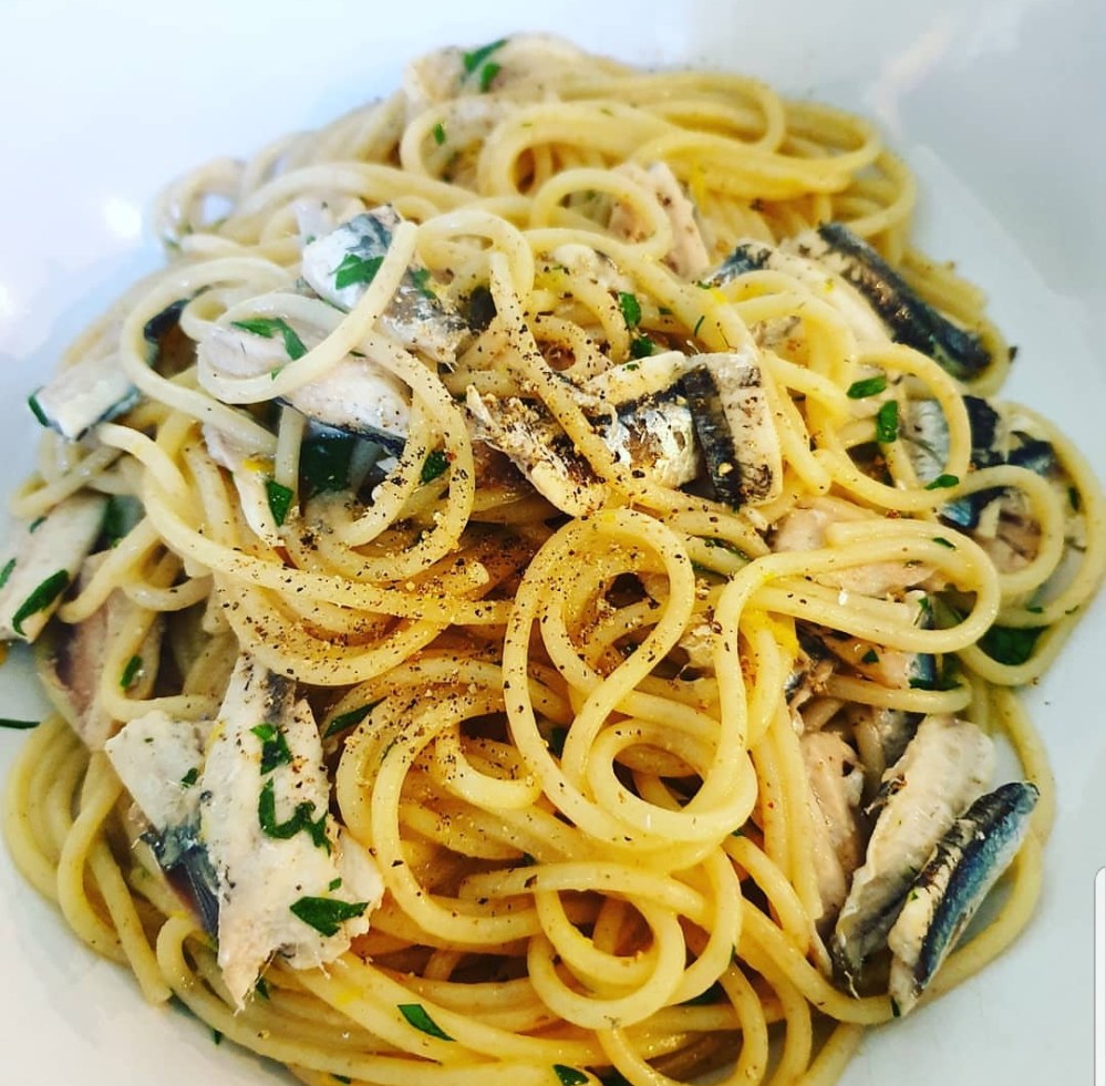 alici fresche pulite – mezzo limone – prezzemolo – 160 gr. di spaghetti ai 5 cereali