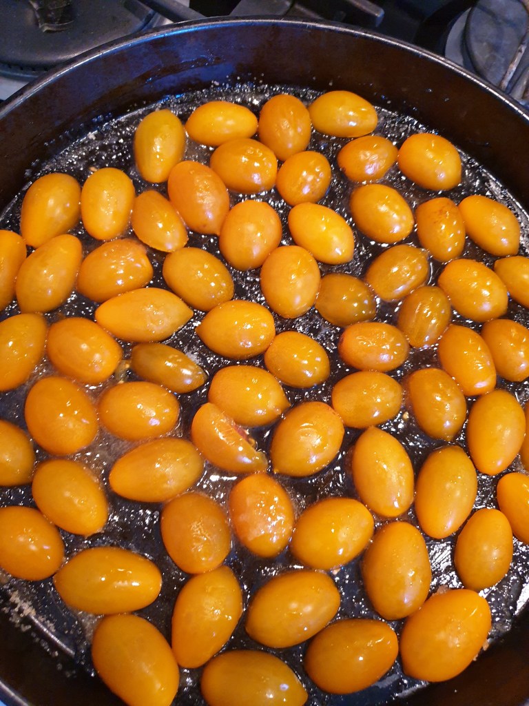 - Appoggia i pomodorini sulla teglia (o padella) dove hai fatto sciogliere lo zucchero. Adagiali a pancia in sù (vedi foto) cioè dal lato che è tagliato sulla teglia