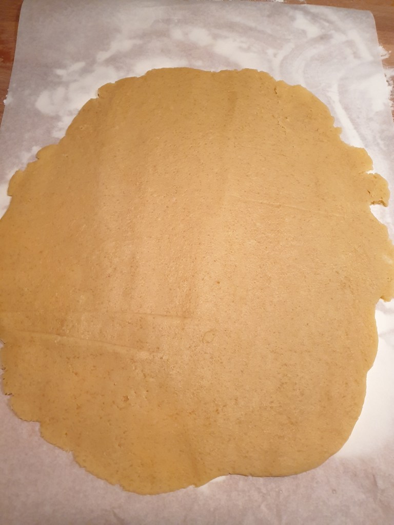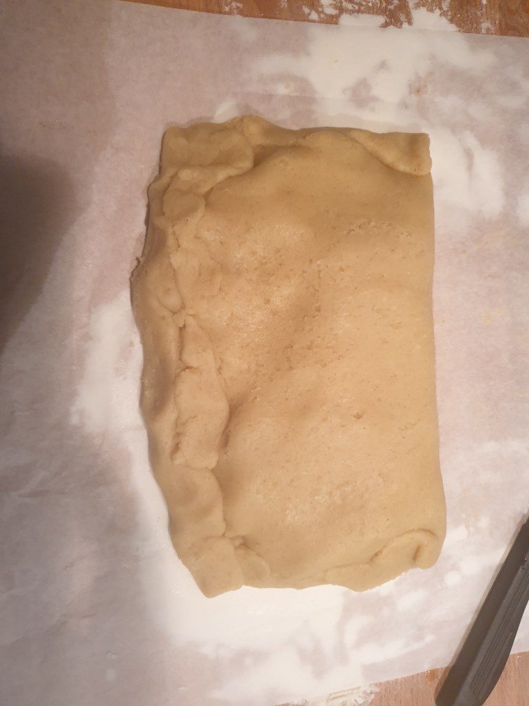 - Stendi la pasta frolla sul foglio di carta forno in modo da formare un rettangolo (vedi foto sotto)