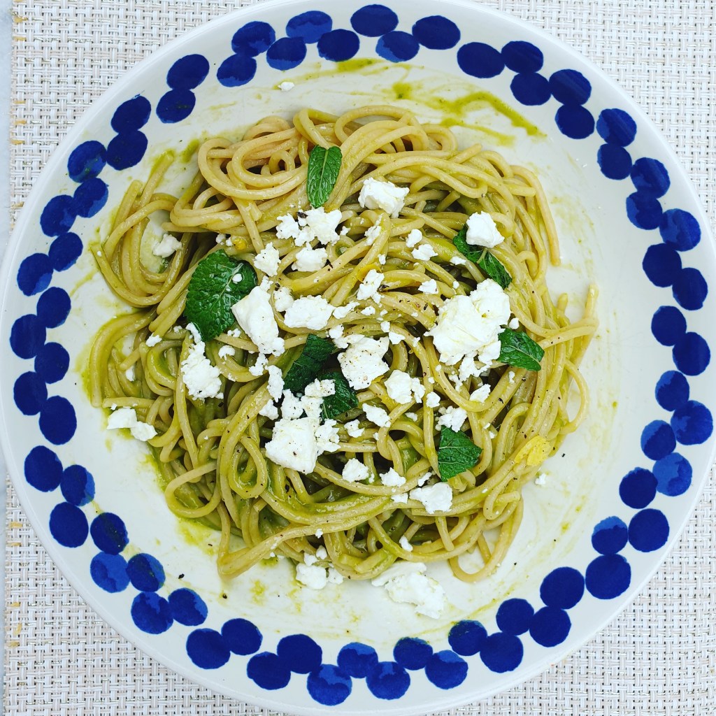 - Versa gli spaghetti nei piatti da portata, sbriciola la feta, aggiungi i pezzetti di buccia di limone, la menta (lavata e asciugata). Condisci il tutto con olio a crudo e pepe