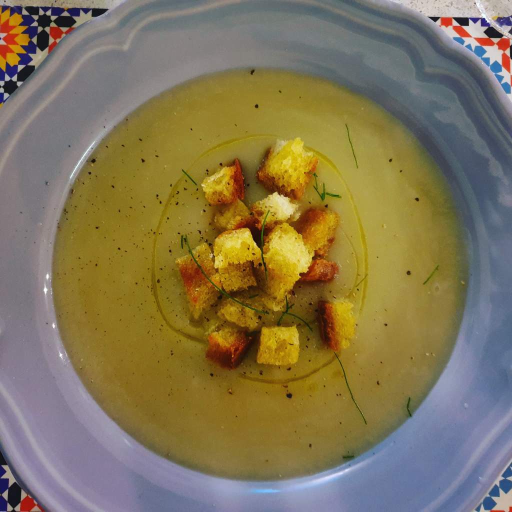 - Servi la vellutata con i crostini di pane, un filo di olio e pepe ed erba cipollina tagliata al coltello
