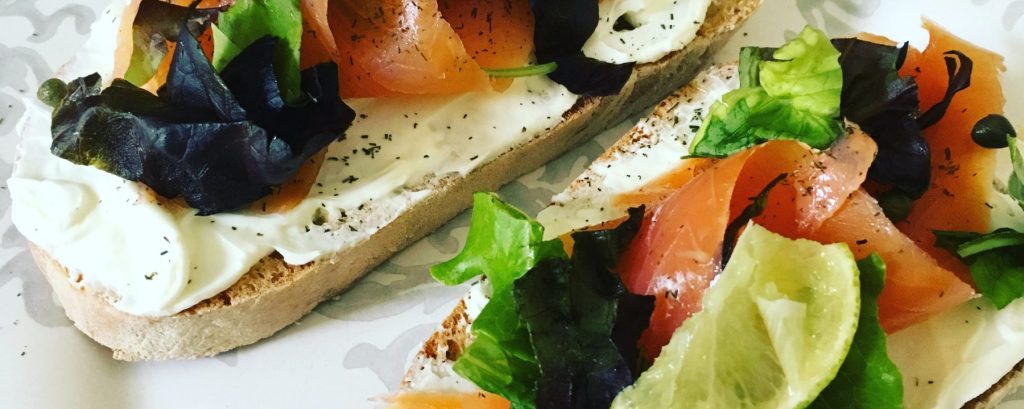 - Prepara i crostoni (lascia l’insalata e il lime tagliato pronto da mettere all’ultimo minuto. Non metterli troppo prima che altrimenti il lime cuoce il salmone e l’insalata perde croccantezza)
