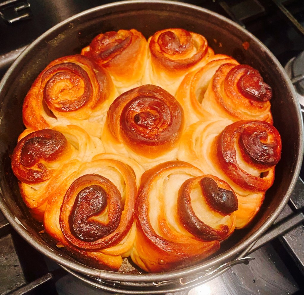 - Prendi l’impasto e sgonfialo e stendilo con il mattarello creando un rettangolo. Spalma la crema sulla superficie dell’impasto lasciando un po’ di spazio al bordo per fare i rotoli